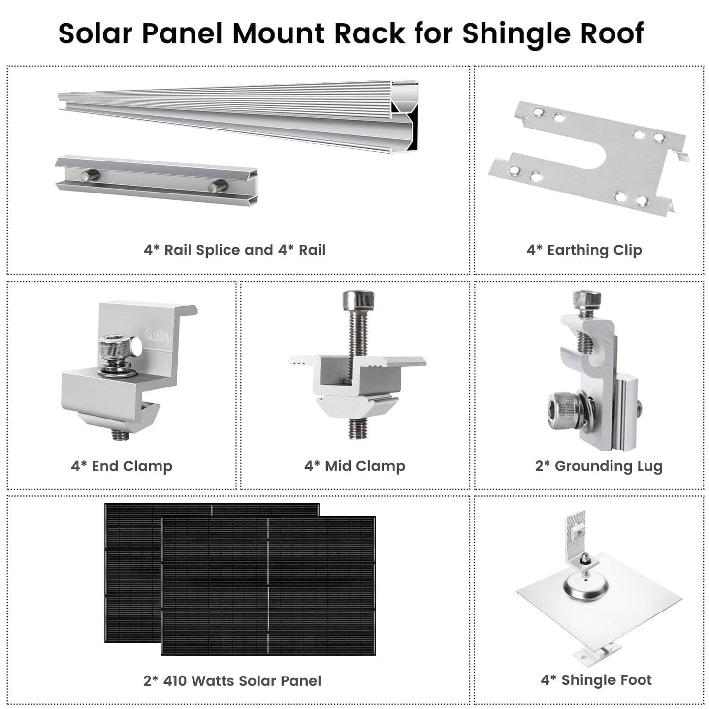 This product includes a 2 Pack of the 410 Watt Solar Panel  with Solar Panel Mount Rack