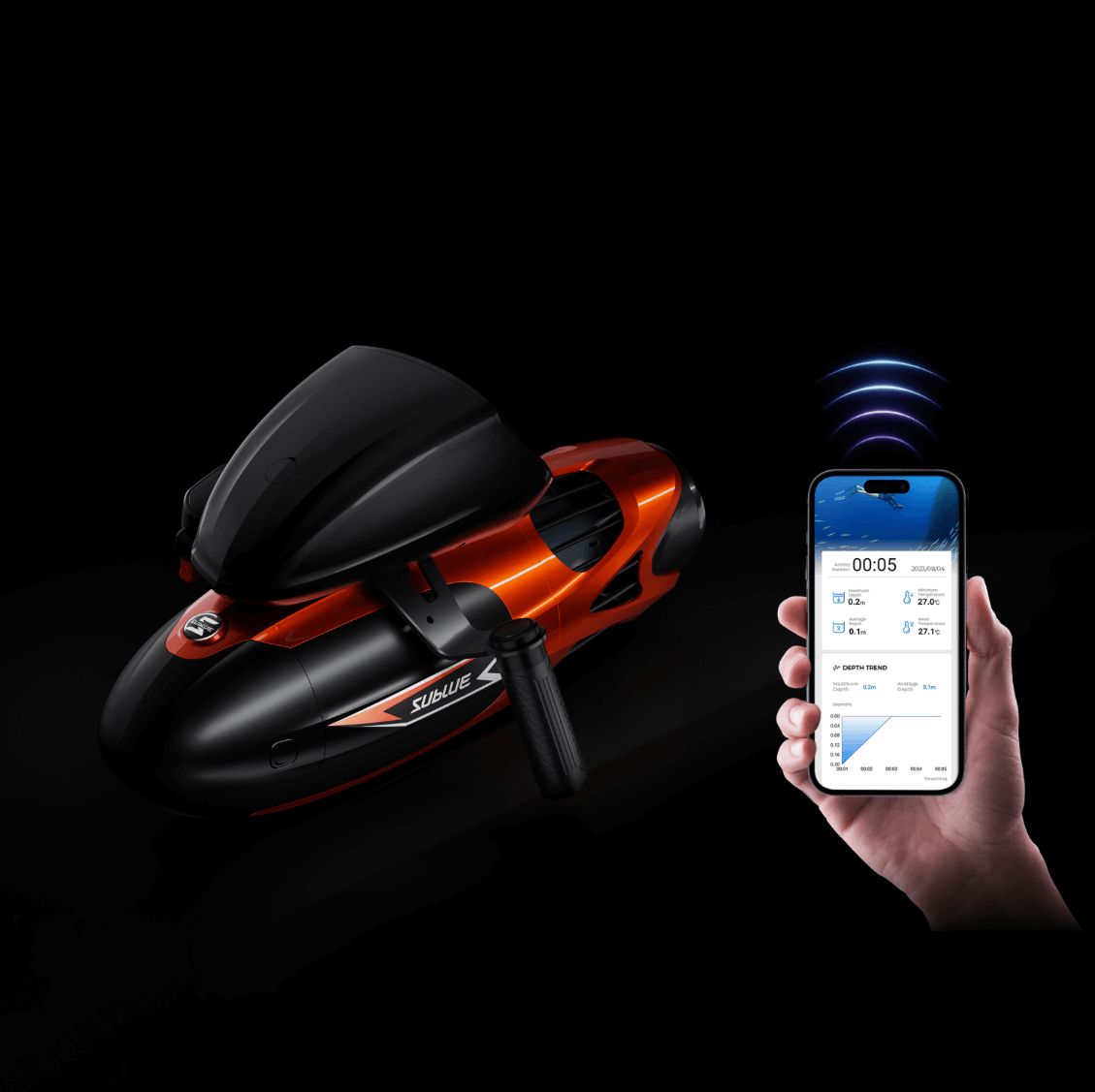 Pair Vapor with the Sublue GO mobile app in seconds and watch every metric come alive on your phone: real-time depth, water temperature, ascent/descent rate, GPS track, battery status, even orientation. Sync your dive log automatically, tweak performance settings, run self-diagnostics, and share immersive journey maps with friends — all through an intuitive dashboard that travels wherever you do.